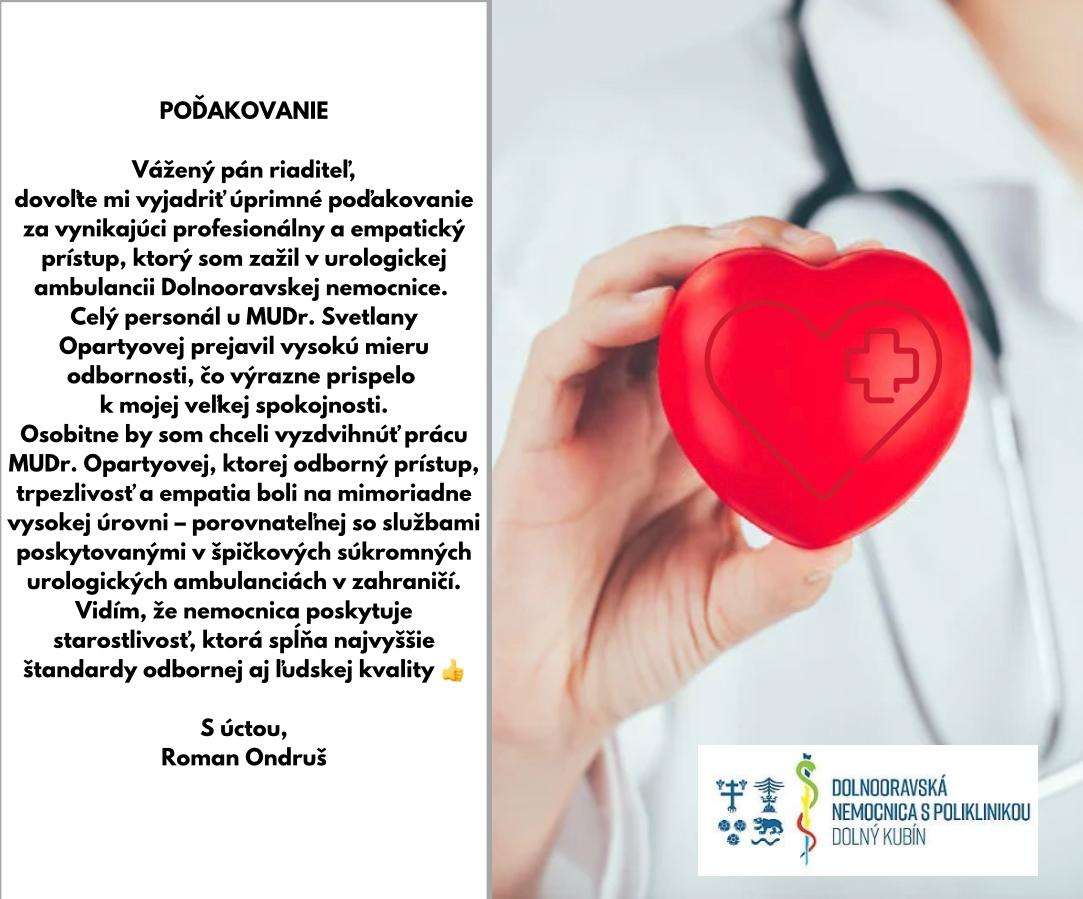 Ďakujeme za Vaše milé slová a úprimné poďakovanie. Veľmi si vážime, že ste si našli čas a podelili sa o svoju pozitívnu skúsenosť s urologickou ambulanciou Dolnooravskej nemocnice.
