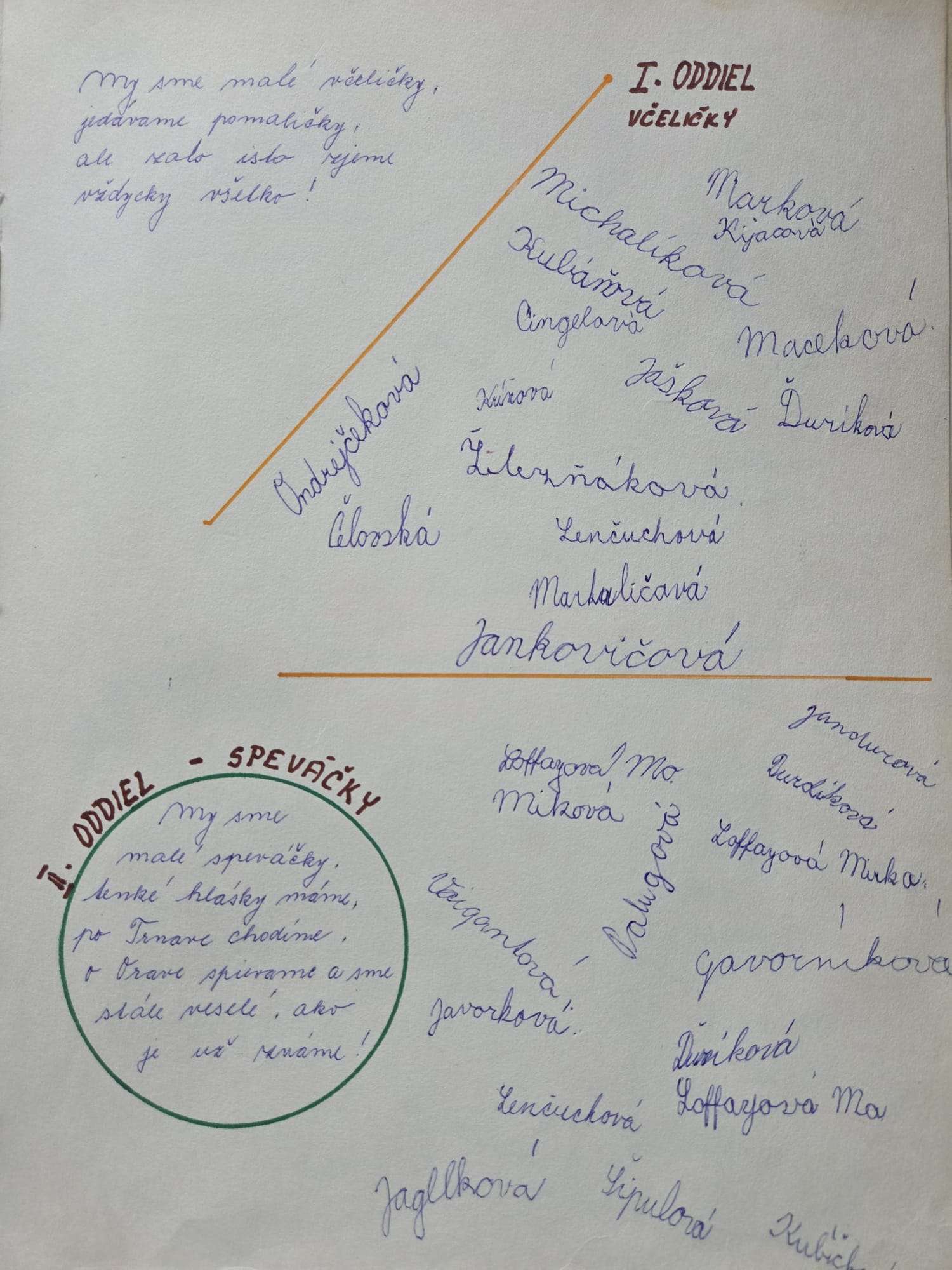 Speváčky a Včeličky„My sme malé speváčky, tenké hlásky máme, po Trnave chodíme, o Orave spievame.“ „My sme malé včeličky, jedávame pomaličky, ale zato isto, zjeme vždycky všetko.“