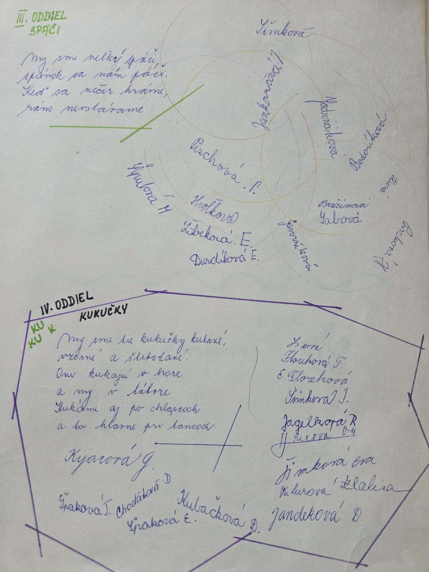 Spáči a Kukučky„My sme malí spáči, spánok sa nám páči, keď sa večer hráme, ráno nevstávame.“ „My sme tie kukučky kukavé, vzorné a štebotavé. Kukáme aj po chlapcoch a to hlavne pri tancoch.“