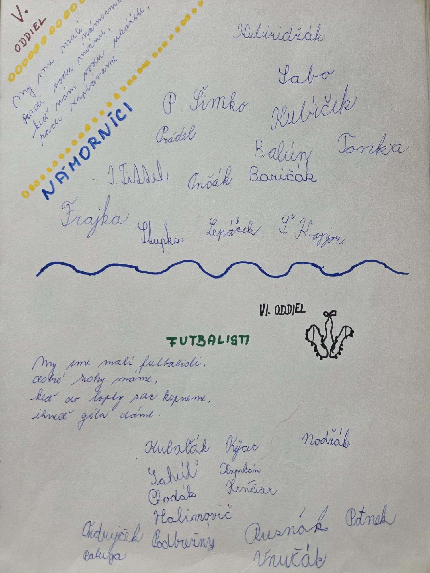 Námorníci a Hladoši„My sme malí námorníci, radi vodu máme, keď nám vodu ukážete, radi zaplávame.“ „Na raňajky dva rožky, to je pre nás málo, tak si ešte pýtame, čo z večere ostalo.“
