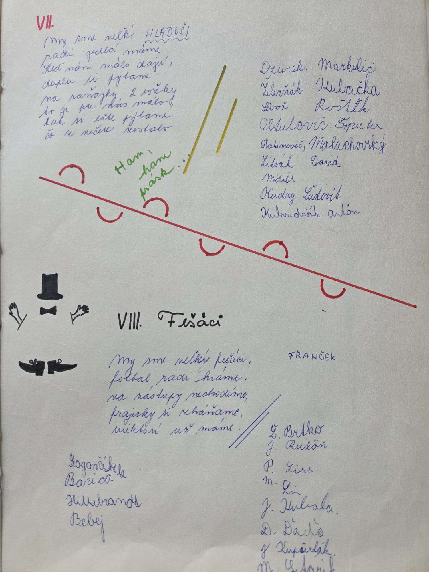 Fešáci a Futbalisti„My sme veľkí fešáci, futbal radi hráme, na nástupy nechodíme, frajerky si zháňame…“ „My sme malí futbalisti, dobré nohy mám, keď do lopty raz kopneme, hneď góla dáme.“