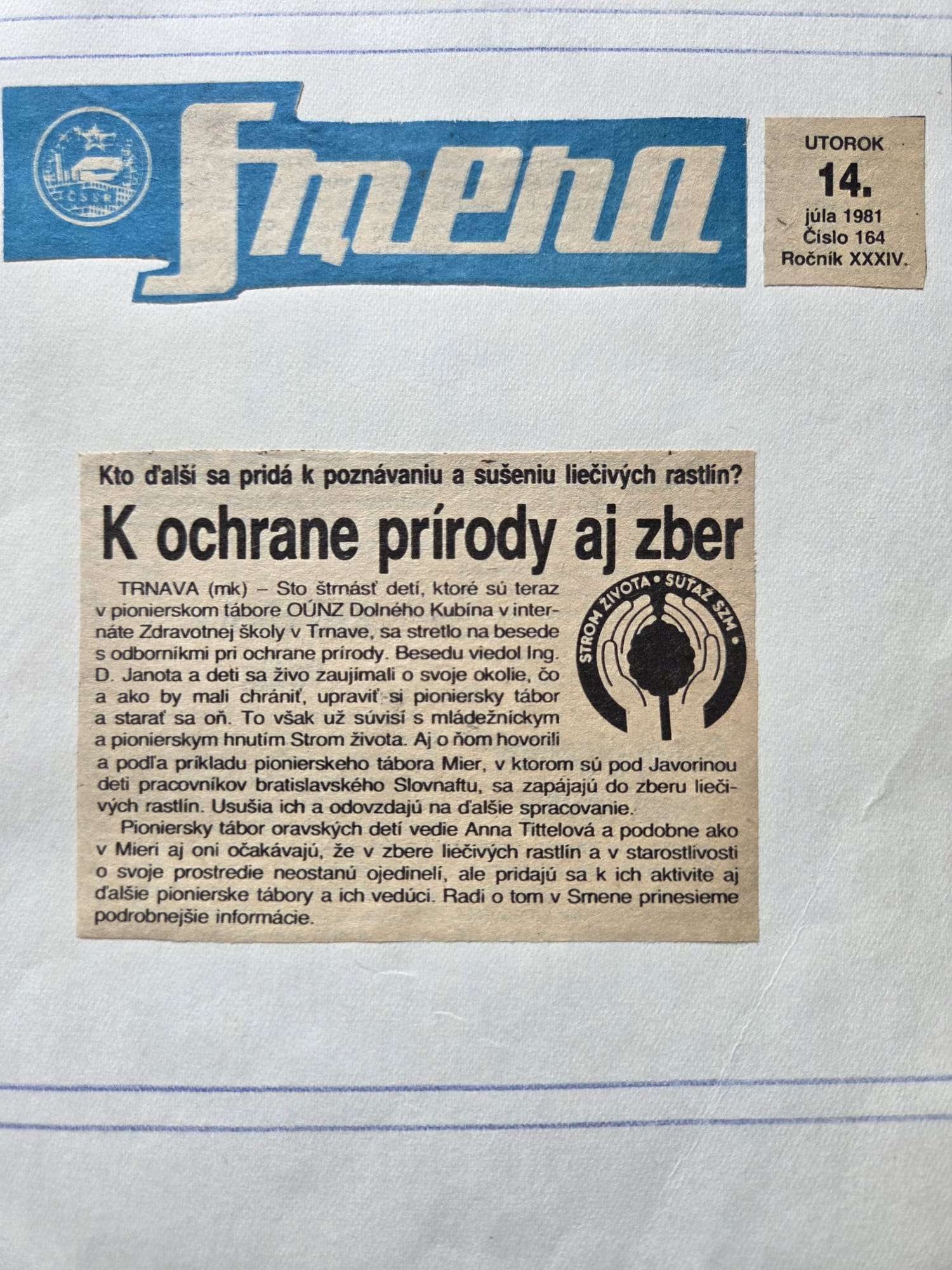 Ako prvý sme z kroniky vybrali rok 1981. V júli toho roku sa niekoľko desiatok detí našich zamestnancov vybralo na pioniersky tábor do Trnavy. Pod vedením Anny Tittelovej a jej zástupkyne Natálie Rúžičkovej prežili deti od 7. do 24. júla dni plné dobrodružstva, na ktoré sa nezabúda.