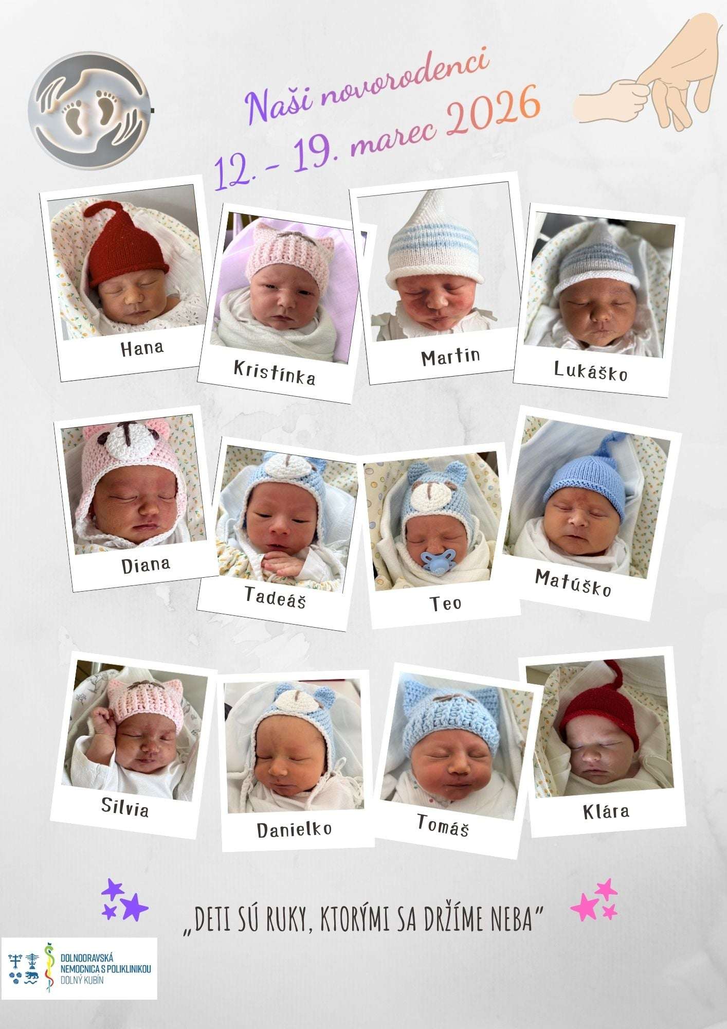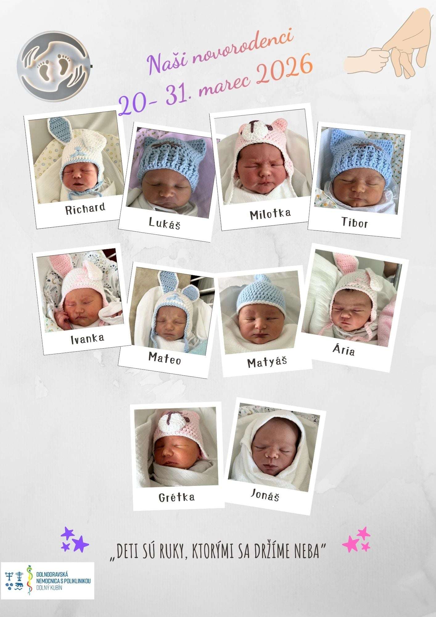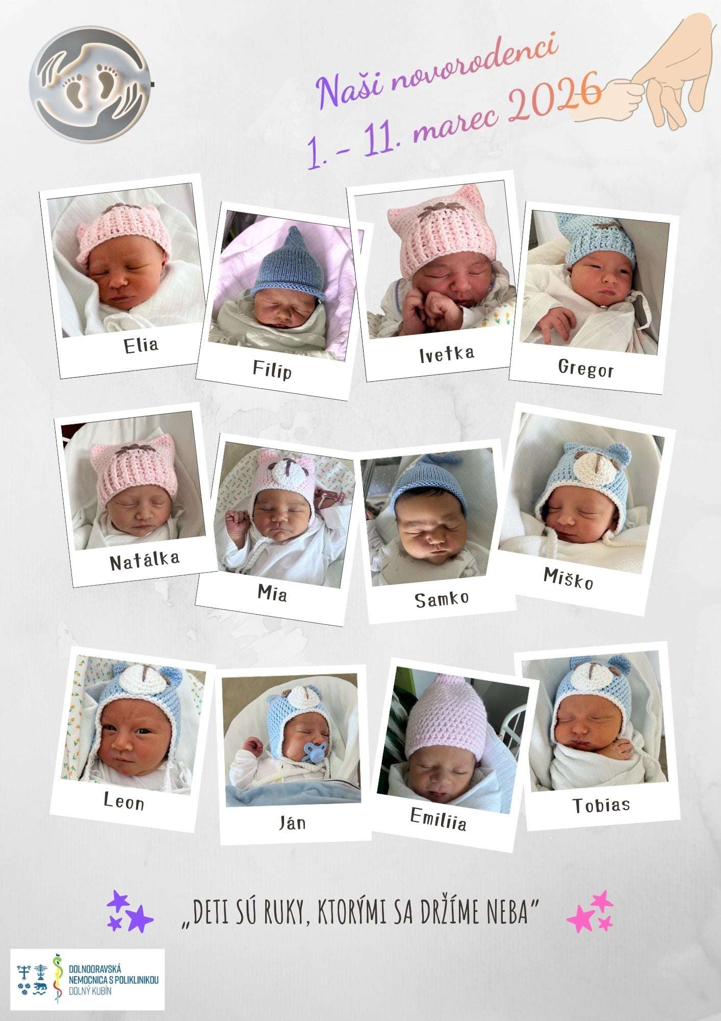 Milé detičky, prajeme vám, aby bol váš život plný zdravia, lásky a radosti, aby ste rástli v bezpečí objatí, s úsmevom na perách a s očami plnými zvedavosti na svet okolo vás.