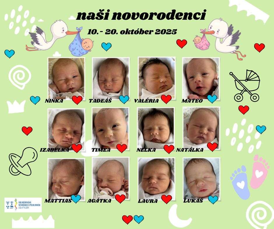 S veľkou radosťou oznamujeme, že v októbri 2025 sa v pôrodnici Dolnooravskej nemocnice narodilo bábätiek – z toho 29 dievčatiek a 25chlapčekov. Potešili nás dva páry dvojičiek.